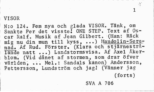 //// 1 //// VISOR //// N:o 124. Fem nya och glada VISOR. Tänk, om Sankte Per det visste! ONE STEP. Text af Oscar Ralf. Musik af Jean Gilbert. (Han: Räck mig nu din mun till kyss, Mandolin-Sere- //// nad. Af Rud. Förster. (Klara och stjärnestrå-lande natt ...) Landstormsvisa. Af Axel Åkerblom. (Vid dånet af stormen, som drar Öfver världen, ... Mel.: Sandals kanon) Andersson, Pettersson, Lundström och jag.' (Vänner jag //// (forts) //// SVA A 706 ////