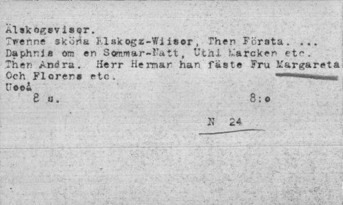 //// Al skogsvis sr. //// Tvenne sköna Mskogs-Wiisor, Then Första. ... Daphnis öm en Sommar-Katt, Uthi Karcken etc. Then Andra. Herr Hermar han fäste Fru Margareta //// Och Florens etc. ...11,11 «»»«*«*«, //// Ueeå //// 8a. 8;© //// 2? £4 . ////