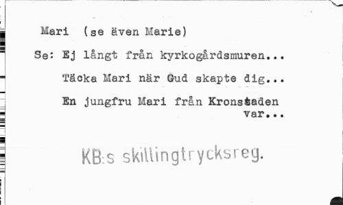 //// | Mari (se även Marie) i //// : Se: Ej långt från kyrkogårdsmuren... //// - Täcka Mari när Gud skapte dig... //// En jungfru Mari från Kronsfcaden j var... //// | KB s skillingtrycksreg. //// M ////