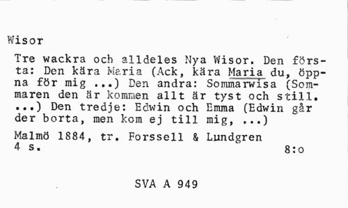 //// Wisor //// Tre wackra och alldeles Nya Wisor. Den första: Den kära Maria (Ack, kära Maria du, öppna för mig ...) Den andra: Sommarwisa (Sommaren den är kommen allt är tyst och still. ...) Den tredje: Edwin och Emma (Edwin går der borta, men kom ej till mig, ,..) //// Malmö 1884, tr. Forssell & Lundgren 4 s. 8:0 //// SVA A 949 ////