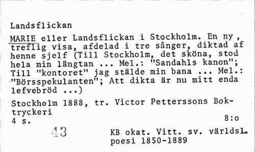 //// Landsflickan //// MARIE eller Landsflickan i Stockholm. En ny , treflig visa, afdelad i tre sånger, diktad af henne sjelf (Till Stockholm, det sköna, stod hela min längtan ... Mel.: "Sandahls kanon"; Till "kontoret" jag stälde min bana ... Mel.: "Börsspekulanten"; Att dikta är nu mitt enda lefvebröd ...) //// Stockholm 1888, tr. Victor Petterssons Boktryckeri //// 4 s. 8:0 //// 43 KB okat. Vitt. sv. världsl- //// poesi 1850-1889 ////