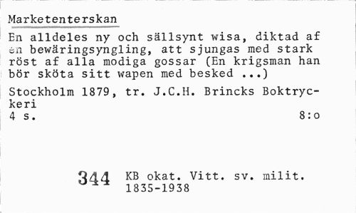 //// Marketenterskan //// En alldeles ny och sällsynt wisa, diktad af en bewäringsyngling, att sjungas med stark röst af alla modiga gossar (En krigsman han bör sköta sitt wapen med besked ...) //// Stockholm 1879, tr. J.C.H. Brincks Boktryckeri //// 4 s. 8:0 //// 844 KB okat. Vitt. sv. milit. //// 1835-1938 ////