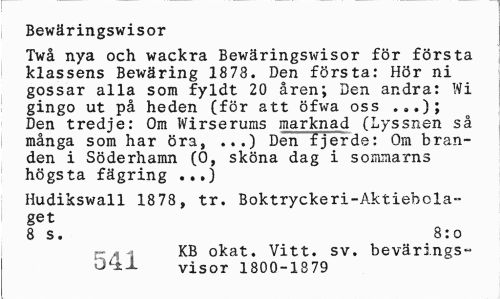 //// Bewäringswisor //// Twå nya och wackra Bewäringswisor för första klassens Bewäring 1878. Den första: Hör ni gossar alla som fyldt 20 åren; Den andra: Wi gingo ut på heden (för att öfwa oss ...); Den tredje: Om Wirserums marknad (Lyssnen så många som har öra, ...) Den fjerde: Om branden i Söderhamn (O, sköna dag i sommarns högsta fägring ..,) //// Hudikswall 18 78, tr. Boktryckeri-Aktiebolaget //// 8 s. 8:o //// KB okat. Vitt. sv. bevärings- //// visor 1800-1879 ////