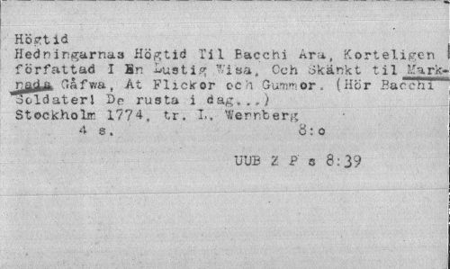 //// Högtid //// Hedningarnas Högtid Til Bacchi Åra, Korteligen författad I In Lustig Wisa, Och Skänkt til '.Turk-j^l^i"- Gåfwa, At Flickor och Gummor, (Hör .Bacchi Soldater! De rusta i dag,.,) Stockholir 1774, tr. I.. Wennberg //// 4 s. ö; o //// UUB Z P s 8:39 ////