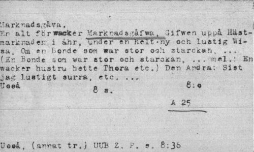//// Tarknads,~åva. //// Sr alt för waste er >' a r k n ad &;: åfwa 8 G i f •w e n u^pa Häat-aarknaöen i ahr, under eiV"!i'e Ii- ny och lustig Wi-sa, Ca en Borde som »ar stor o-3/1 starckan, ... ' Er. Bonde son war stor och starcxan, .. . el. r En vacker hustru hette Thora etc.} Den Andra; Sist iag lustigt surra, etc, ... //// Jo eå o S;0 //// o s. //// A 25 //// Jeeå, (annat tr.) UUB Z, P. ?. 8:3^ ////