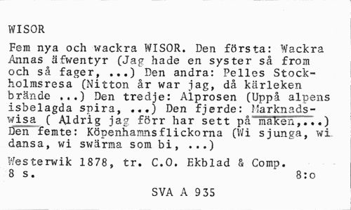 //// WISOR //// Fem nya och wackra WISOR. Den första: Wackra Annas äfwentyr (Jag hade en syster så from och så fager, ...) Den andra: Pelles Stockholmsresa (Nitton år war jag, då kärleken brände ...) Den tredje: Alprosen (Uppå alpens isbelagda spira, ...) Den fjerde: Marknads-wisa ( Aldrig jag förr har sett på maKen,...) Deri femte: Köpenhamns flickorna (Wi sjunga, wi dansa, wi swärma som bi, ...) //// Westerwik 1878, tr. C.O. Ekblad & Comp. 8 s. ~ 8:0 //// SVA A 9 35 ////