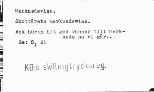 //// i Marknadsvisa. //// ¦ Skottårets marknadswisa. //// Ack hören hit god vänner till mark- //// - nads nu vi går... //// " Se; G1 El //// j KB:S skillingtrycksreg, . //// r i //// i M ////