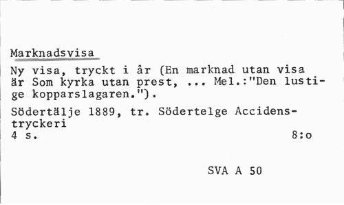 //// Marknadsvisa //// Ny visa, tryckt i år (En marknad utan visa är Som kyrka utan prest, ... Mel.:"Den lustige kopparslagaren.'1). //// Södertälje 1889, tr, Södertelge Accidens-tryckeri //// 4 s. 8:0 //// SVA A 50 ////