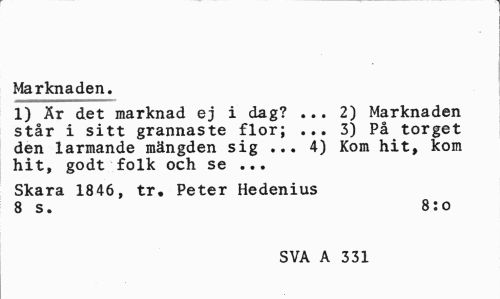 //// Marknaden. //// 1) Är det marknad ej i dag? ... 2) Marknaden står i sitt grannaste flor; ... 3) På torget den larmande mängden sig ... 4) Kom hit, kom hit, godt folk och se ... //// Skara 1846, tr. Peter Hedenius 8 s. 8:o //// SVA A 331 ////