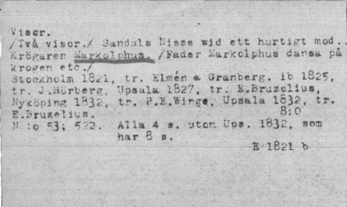//// 'V ii or. //// 1/Två visor./ Sandals Vi s*e wid ett hurtigt mod. K.röturer Äirjyj^Jj^j^/Fadar -»larkolphus dansa på kroger; et c,/ //// dtoc/choigr» 13*1, tr. Elmén a. Sranbcrg. ib 1825, tr. J .Hörberg, 'Jpaula 1&27, tr. i.Bruzcliua, Nyt öp i 1832, tr. P.E.Viftg-i, Upaala 1832, tr. E.Bruaeliua. B:0 //// N : o c3; 532. All* 4- ». ytor. Up». 1832, som har 8 s. //// E-18-21 b ////