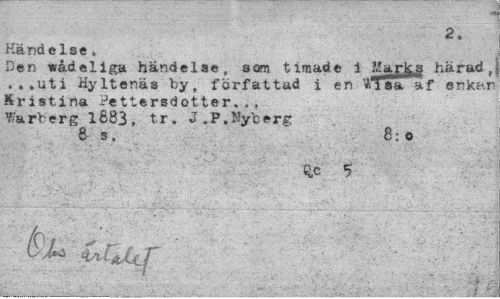 //// 2»- . //// Händelse * //// Den wådeliga händelse, som timade i Mark,g härad, ..»uti %Itsnäs by, författad i en TIsa *f enkan Kristina Pettersdotter.., Värberg 1883, tr. J.P.Nyberg //// 8 s. 8:o //// Q,c 5 ////