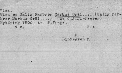 //// H sa. //// f,?i*a om Salig Farbror Markus Gräl ... (Salig farbror Markus GrSl, ..,} lav Ö ,'J.1 ind egr«n} Nyköping i800. tr. P.tfirge. //// 4 s. 8-o //// Lind egren h //// « ////