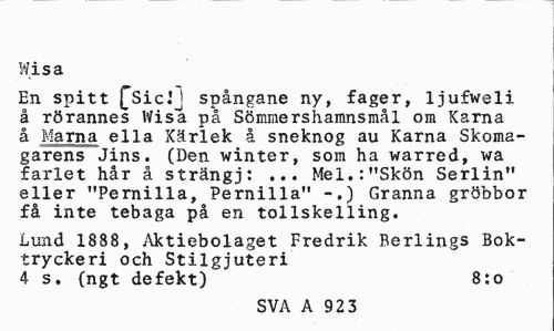 //// Wisa //// En spitt [SicJJ spångane ny, fager, ljufweli å rörannes Wisa på Sömmershamnsmål om Karna å Marna ella Kärlek å sneknog au Karna Skoma-garens Jins. (Den winter, som ha warred, wa farlet hår å strängj: ... Mel.:"Skön Serlin" eller "Pernilla, Pernilla" -.) Granna gröbbor få inte tebaga på en tollskelling. //// Lund 1888, Aktiebolaget Fredrik Berlings Boktryckeri och Stilgjuteri //// 4 s. (ngt defekt) 8:0 //// SVA A 92 3 ////