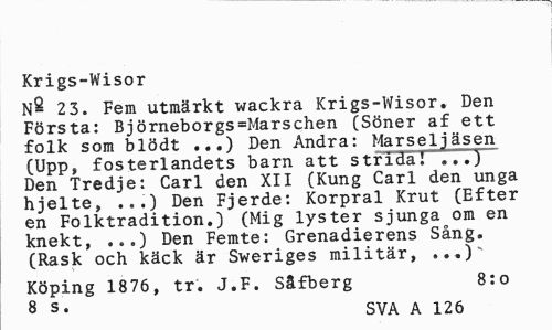 //// Krigs-Wisor //// N^ 23. Fem utmärkt wackra Krigs-Wisor, Den Första: Björneborgs=Marschen (Söner af ett folk som blödt ...) Den Andra: Marseljäsen (Upp, fosterlandets barn att strida!""...) Den Tredje: Carl den XII (Kung Carl den unga hjelte, ...) Den Fjerde: Korpral Krut (Efter en Folktradition.) (Mig lyster sjunga om en knekt, ...) Den Femte: Grenadierens Sång. (Rask och käck är Sweriges militär, ...)" //// Köping 1876, tr. J.F. Såfberg 8:0 //// 8 s' SVA A 126 ////
