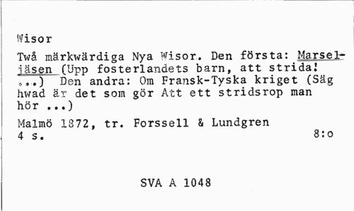 //// Wisor //// Twå märkvärdiga Nya Wisor. Den första: Marsel-läsen_(Upp fosterlandets barn, att strida! o..) Den andra: Om Fransk-Tyska kriget (Säg hwad är det som gör Att ett stridsrop man hör ...) //// Malmö 1872, tr. Forssell & Lundgren 4 s. 8:0 //// SVA A 1048 ////