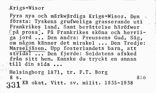 //// -Krigs =Wisor //// Fyra nya och märkwärdiga Krigs=Wisor. Den första: Tyskens grufweliga grasserande uti Frankrikes land. Samt berättelse häröfwer fpå prosa^. På Frankrikes sköna och herrliga jord ... Den andra: Preussens Gud. Säg, om någon känner det mirakel ... Den Tredje: Marseljäsen. Upp fosterlandets barn, att strida! ...Den fjerde: Soldatens afsked från sitt hem. Kanske du tryckt en annan till din sida ... //// Helsingborg 1871, tr. F.T. Borg 8 s. 8:0 //// okat. Vitt. sv. milit. 1835-1938 ////