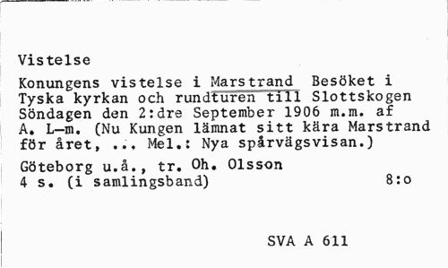 //// Vistelse //// Konungens vistelse i Marstrand Besöket i Tyska kyrkan och rundturen till Slottskogen Söndagen den 2:dre September 1906 m.m. af A. L-m. (Nu Kungen lämnat sitt kära Marstrand för året, ... Mel.: Nya spårvägsvisan.) //// Göteborg u.å., tr. Oh. Olsson 4 s. (i samlingsband) 8:o //// SVA A 611 ////