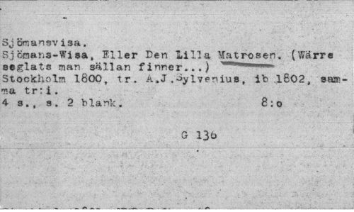//// 3j ömansv i sa. //// Sj Ömaiis-Wisa, Eller Den Lilla Matrosen. (Warre seglats man sällan finner...) ¦ //// Stockholm 1800, tr. A,J .Sylvenius, ib 1802, saan-?! a tr:i. //// 4- s., s. 2 blank. 8:0 //// G 13b ////