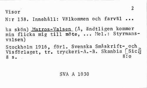 //// Visor ^ //// N:r 138. Innehåll: Välkommen och farväl ... //// ka skön) Matros-Valsen (Å, ändtligen kommer min flicka mig till möte, ... Mel.: Styrmansvalsen) //// Stockholm 1916, förl. Svenska Småskrift- och^ Visförlaget, tr. tryckeri-A.-B. Skanbia fSici] 8 s. 87o //// SVA A 1030 ////