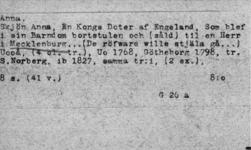 //// ^nna. //// 3kjb'n Anna, En Kongs Böter af Engeland, Som "blef i sin Barndom bortstulen och (såld) til en Herr i Mecklenburg.«.(De röfware trilla stjäla gå...) 3oöTTT¥~^r-tr.), Uo 1768, Göthe^org 1798, tr. 3.Norberg, ib 1827, samma tr:i, (2 ex.), //// 3 a. (41 v.) 8;o //// ;-V. ..v :•> '¦ 26 a ////