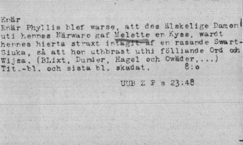 //// "firär //// Enär Phyllis bl ef warse, att des älskelige Parson uti hennes Kärwaro gaf Kelette en Kyss( wardt hennes hierta straxt i rTffSj'! 'I - af en rasande Swart Siuka , så att hor uthbraat- uthj folliande Ord och Wijsa. (BLixt, Dunder, Hagel och Owäder,,..) Tit.-bl. och sista bl. skadat. 8:0 //// UtlB Z F s 23; 48 ////