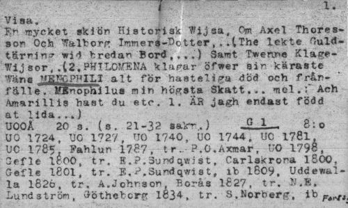 //// ¦• ¦,:" f : • I« //// Visa, //// En Trycket skion Historisk Wijsa, Om Axel Thores-son Och Valborg Immerai-Dottep, . .iThe lekte GuM-tJS.rr.tng wid bredas Bord, ...} Sarnt Twenne Klage-Wijsor,,C2.PH1LOMENA klagar öfwer sir käraste mn* ttsmpmil alt för haateliga död och från» ' fäll e. lOtnophi lus min högsta Skatt... mel.:" Ach Amarillis hast du etc. 1. ÄR jagh endast född at lida...) //// UOOÅ 20 s. (s. 21-32 sak-r.) -G 1 - 8: o UG 1724, UG 1727, UG 1740, UC 1744. UC 1781, UC 1785, Pahlun 1787, tr. P.O.Axrcar, UO 1798, C-efle 1c 00, tr. I.?. 3u nd j it, Carlskrona 1800, Gefle 1801, tr. K, P,3undqwist, ib 1809, Uddewal-la 1826, tr. A.Johnson, Borås 1827, tr. U.E. Lundström, Göthebcrg 1834, tr. S.Norberg, ib ////