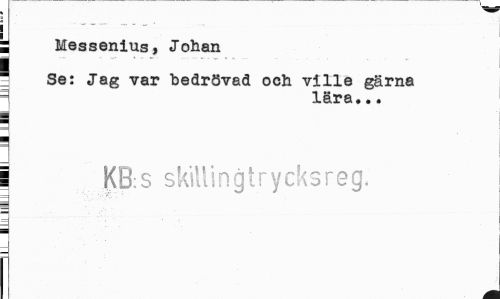 //// i Messenius, Johan //// " Se: Jag var bedrövad och ville gärna //// =j lära... //// § //// 1 KB:s skillingtrycksreg. //// 4 ////