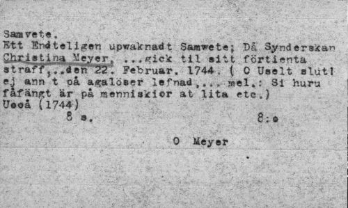 //// Saavete. //// TStt ®ndteligen upwaknadt Samvetej Då Synderskan Chr^tlna Meyer. ...gick til sitt förtienta stra/f,.T«dK 22. Februar. 1744. \ O Uselt slut! ej ann't på agaloser lefnad,.., mel»: Si huru fåfängt är på menniskicr at lita etc.) Usoå (1744) //// 8 », ¦ 8: s //// O Meyer ////