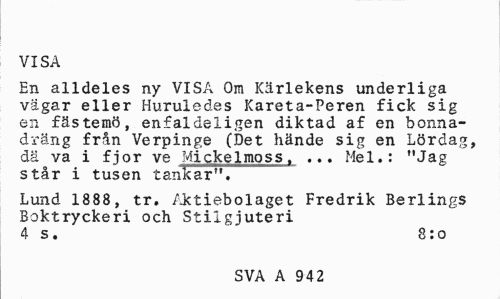 //// VISA //// En alldeles ny VISA Om Kärlekens underliga vägar eller Huruledes Kareta-Peren fick sig en fästemö, enfaldeligen diktad af en bonnadräng från Verpinge (Det hände sig en Lördag, dä va i fjor ve Mickelmoss, ... Mel.: "Jag står i tusen tankar". //// Lund 1888, tr. Aktiebolaget Fredrik Berlings Boktryckeri och Stilgjuteri 4 s. 8:0 //// SVA A 942 ////