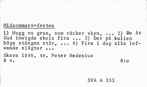 //// Mi ds ömma r s s fe s ten //// 1) Hugg en gran, som räcker skyn, ... 2) De åt Gud inwigde skola fira ... 3) Der på kullen höga stången står, ... 4) Fira i dag alla lef-wande slägter ... //// Skara 1846, tr. Peter Hedenius 8 s . 8: o //// SVA A 2 333 ////