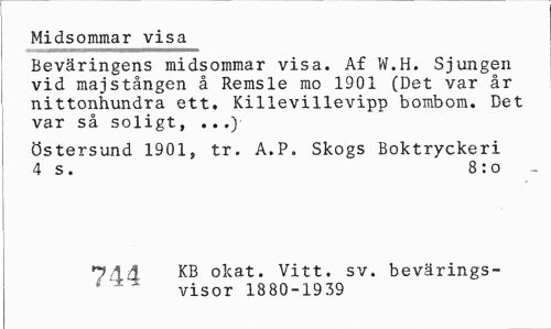 //// Midsommar visa //// Beväringens midsommar visa. Af W.H. Sjungen vid majstången å Remsle mo 1901 (Det var år nittonhundra ett. Killevillevipp bombom. Det var så soligt, ...) //// Östersund 1901, tr. A.P. Skogs Boktryckeri 4 s. 8:o //// 74.4 KB okat. Vitt. sv. bevärings- //// " " visor 1880-1939 ////
