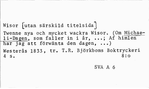 //// Wisor [utan särskild titelsida"! //// Twenne nya och mycket wackra Wisor. (Om Michae-li-Dagen, som faller in i år, ...; Af himlen har jag att förwänta den dagen, ...) //// Westerås 1833, tr. T.R. Björkboms Boktryckeri 4 s. 8:0 //// SVA A 6 ////