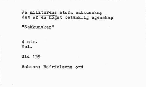 //// Ja militärens stora sakkunskap det är en högst betänklig egenskap //// "Sakkunskap" //// 4 str• Mel. //// Sid 139 //// Bohman: Befrielsens ord ////