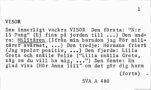 //// 1 //// VISOR //// Sex innerligt vackra VISOR Den första: "N:r 15 Pang" (Ej fins på jorden till ...) Den andra: Militären (Ifrån min barndom jag För militärer svärmat, ...) Den tredje: Hermans frieri (Jag spelar positiv, ...) Den fjerde: Lilla Greta och snälle Pelle ("Lilla snälla Greta, säg om du vill ha mig? ..,") Den femte: En glad visa (Hör Anna lill" om det gör dig harm //// (forts) . //// SVA A 480 ////