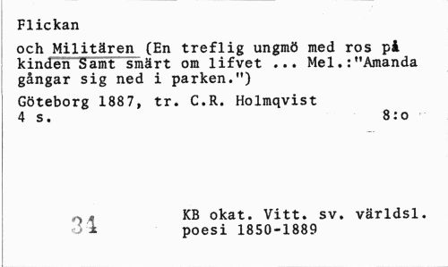 //// Flickan //// och Militären (En treflig ungmö med ros på kinden Samt smärt om lifvet ... Mel.:"Amanda gångar sig ned i parken.") //// Göteborg 1887, tr. C.R. Holmqvist 4 s. 8:0 //// , , KB okat. Vitt. sv. världsl. //// x poesi 1850-1889 ////