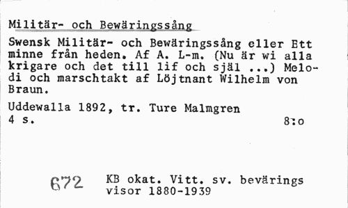 //// Militär- och Bewäringssång //// Swensk Militär- och Bewäringssång eller Ett minne från heden. Af A. L-m. (Nu är wi alla krigare och det till lif och själ ...) Melodi och marschtakt af Löjtnant Wilhelm von Braun. //// Uddewalla 1892, tr. Ture Malmgren 4 s. 81 o //// O**)*} KB okat. Vitt. sv. bevärings //// visor 1880-1939 ////