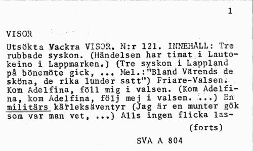 //// 1 //// VISOR //// Utsökta Vackra VISOR. Il:r 121. INNEHÅLL: Tre rubbade syskon. (Händelsen har timat i Lauto-keino i Lappmarken.) (Tre syskon i Lappland på bönemöte gick, ... Mel.:"Bland Värends de sköna, de rika lunder satt") Friare-Valsen. Kom Adelfina, föll mig i valsen. (Kom Adelfina, kom Adel fina, följ mej i valsen. ...) En militärs kärleksäventyr (Jag är en munter gök som var man vet, ...) Alls ingen flicka las- //// (forts) //// SVA A 481 ////