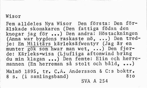 //// Wisor //// Fem alldeles Nya Wisor Den första: Den förälskade skomakaren (Den fattiga födan den knogar jag för ...) Den andra: Hös täckningen (Anna war bygdens raskaste mö, ...) Den tredje: En Militärs kärleksäfwentyr (Jag är en munter gök söm hwar man wet, ...) Den fjer-de: Kärleks=wisa (Ljufliga aftonwind bring du min klagan ...) Den femte: Elin och herremannen (En herreman så stolt och båld, ..,) //// Malmö 1895, tr. C.A. Andersson & C:s boktr. 8 s. (i samlingsband) 8:0 //// SVA A 254 ////