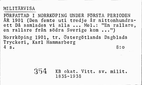 //// MILITÄRVISA //// FÖRFATTAD I NORRKÖPING UNDER FÖRSTA PERIODEN ÅR 1901 (Den femte uti tredje år nittonhundra-ett Då samlades vi alla ... Mel.: "En rallare, en rallare från södra Sverige kom ...") //// Norrköping 1901, tr, Östergötlands Dagblads Tryckeri, Karl Hammarberg 4 s. 8:o //// 354 KB okat. Vitt. sv. milit. //// 1835-1938 ////