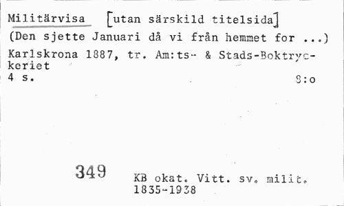 //// Militärvisa [utan särskild titelsida^] //// (Den sjette Januari då vi från hemmet for ..») //// Karlskrona 1887, tr. Am:ts- & Stads-Boktryckeriet //// 4 s. 3:o //// 349 KB okat „ Vitt. sv. railiu //// 1835-1938 ////