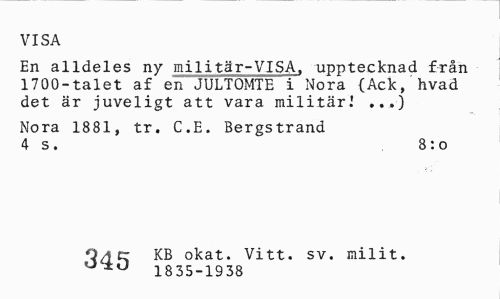 //// VISA //// En alldeles ny militär-VISA, upptecknad från 1700-talet af en JULTOMTE i Nora (Ack, hvad det är juveligt att vara militär! ...) //// Nora 1881, tr. C.E. Bergstrand 4 s. 8:o //// O^cr KB okat. Vitt. sv. milit. //// 1835-1938 ////