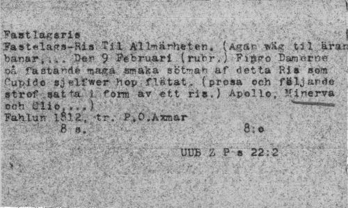 //// Fastlagsris //// .Fast*la»»-Ris Til All-närheten. (a*** *ft« til ärar banar,,.. Der 9 Februari (rubr.) FiH?o i3am«rrt« " .P& fastande maga smaka s.©t*nah af detta Ris som rup-iåt sjelfwer hop flätat. (prosa och filjaWe strof sat ta i. form av ett ris.) ApoUo Minerva och Cl i o...) - - - //// Fahlun 1$12, tr. P.O.Axmar //// 8 8> 8; e //// ••.-/••f,- * ¦ ¦ : .V >;:,c H'X //// '' '5' v-"'""-" UUB Z P s 22: 2 ' ' //// t: - - ^ ¦ § ////