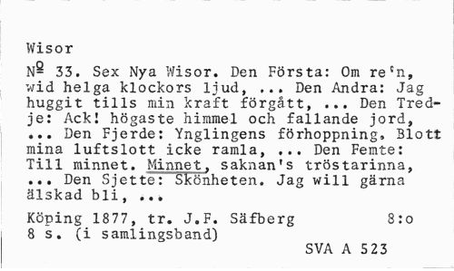 //// Wisor //// N- 33. Sex Nya Wisor. Den Första: Om re5n, wid helga klockors ljud, ... Den Andra: Jag huggit tills min kraft förgått, ... Den Tredje: Ack! högaste himmel och fallande jord, ... Den Fjerde: Ynglingens förhoppning. Blott mina luftslott icke ramla, ... Den Femte: Till minnet. Minnet, saknan's tröstarinna, ... Den Sjette: Skönheten. Jag will gärna älskad bli, ... //// Köping 1877, tr. J.F. Säfberg 8:0 //// 8 s. (i samlingsband) //// SVA A 5 23 ////