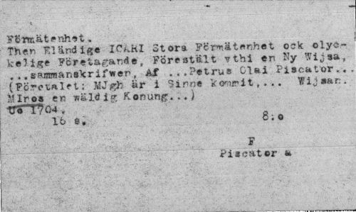 //// F$raät<»nh*t. //// Then Eländige ICUil Stora Förmätnnhat ock olyo-kelige Företagande, Förestält vthi en Ny Wijaa, .. .sajBreänakrifwen, Af ...Petrus Glai Piacator.. (Företalet; MJgfc är i Sinne kommit, . .. Wijaar. MIroa en -w&ld i» Konung. ..) tr«"I704. //// 15 e. 8; o //// F //// Piscator a ////