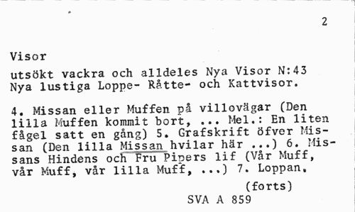 //// # //// 2 //// Visor //// utsökt vackra och alldeles Nya Visor N:43 Nya lustiga Loppe- Råtte- och Kattvisor. //// 4. Missan eller Muffen på villovägar (Den lilla Muffen kommit bort, ... Mel.: En liten fågel satt en gång) 5. Grafskrift öfver Missan (Den lilla Missan hvilar här ...) 6. Missans Hindens och Fru Piners lif (Vår Muff, vår Muff, vår lilla Muff, ...) 7. Loppan. //// (forts) //// SVA A 859 ////