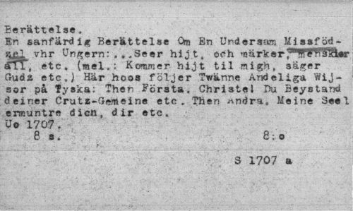 //// Berättelse. //// In sanfärd ig Berättelse Qn En Undersam Missföd- //// vhr Ungern: ., .Seer hijt, och märksrf^lfffflSflar äuT, etc. (mel.: Kommer hijt til migh, säger Guds etc.) Här hoos följer Twänne Andeliga Wij-sor på Tyska: Then Första, Christel Du Beystand deiner Cruts-Gemeine etc. Then ^ndra, Meine 3ee 1 ermuntre dicns dir etc. Uo 1707. //// 8 a , 8;o //// S 1707 a ////