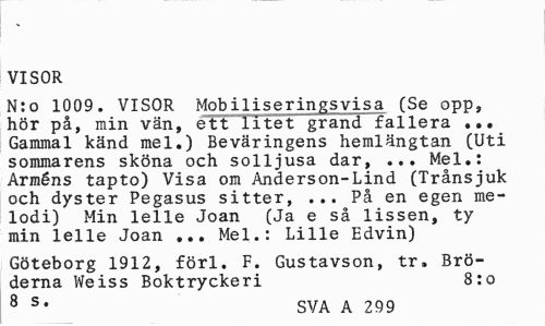 //// VISOR //// N:o 1009. VISOR Mobiliseringsvisa (Se opp, hör på, min vän, ett litet grand fallera ... Gammal känd mel.) Beväringens hemlängtan (Uti sommarens sköna och solljusa dar, ... Mel.: Arméns tapto) Visa om Anderson-Lind (Trånsjuk och dyster Pegasus sitter, ... På en egen melodi) Min lelle Joan (Ja e så lissen, ty min lelle Joan ... Mel.: Lille Edvin) //// Göteborg 1912, förl. F. Gustavson, tr. Bröderna Weiss Boktryckeri 8:0 //// 8 St SVA A 299 ////