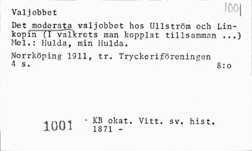 //// Valjobbet //// Det moderata valjobbet hos Ullström och Lin-kopin Cl valkrets man kopplat tillsamman .,.) Mel.: Hulda, min Hulda. //// Norrköping 1911, tr. Tryckeriföreningen 4 s. 8:0 //// + r\ni * okat. Vitt. sv. hist. luUl 1871- ////