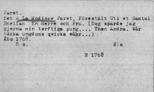 //// Paret, //// Det ^ i,-fl jjodlSKe Paret. Förestält Uti et Samtal Emellan "Tn Hem och Fru. (Nog sparde iag gjerna min torftiga pung,... Then Andra. "Går täcka ungdoms qwicka wåhr..,} Åbo 1768. //// 8 s. 8:o //// E 17fc8 ////