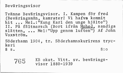 //// Beväringsvisor //// Tvänne Beväringsvisor. I. Kampen för fred (Beväringsmän, kamrater! Vi hafva kommit hit ... Mel.:"Kung Karl den unge hjälte") II. På fältmarsch (Bort ifrån Mohed, sandiga slätten, ... Mel:"Upp genom luften") Af John Voxström. //// Söderhamn 1904, tr. SÖderhamnskurirens tryckeri //// 8 s. 8:0 //// KB okat. Vitt. sv. bevärings- //// visor 1880-1939 ////